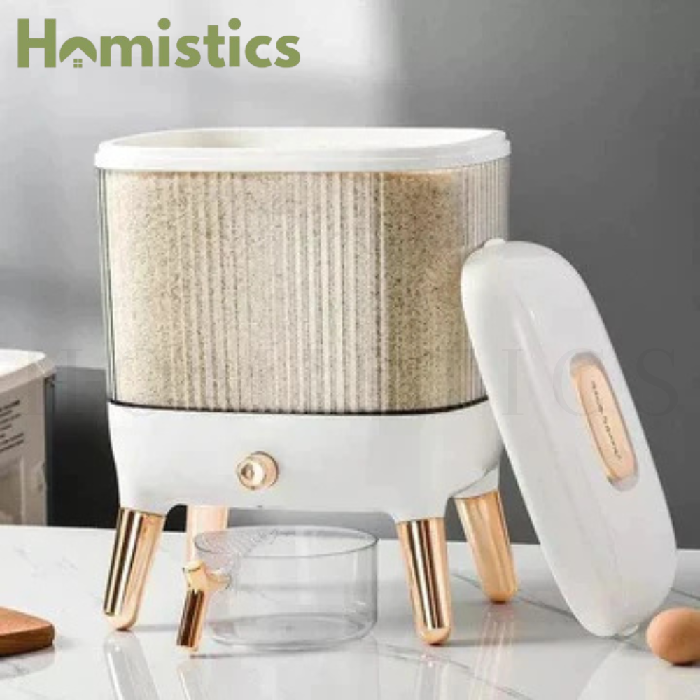 This white plastic food dispenser with gold accents features a large 10kg capacity for storing...