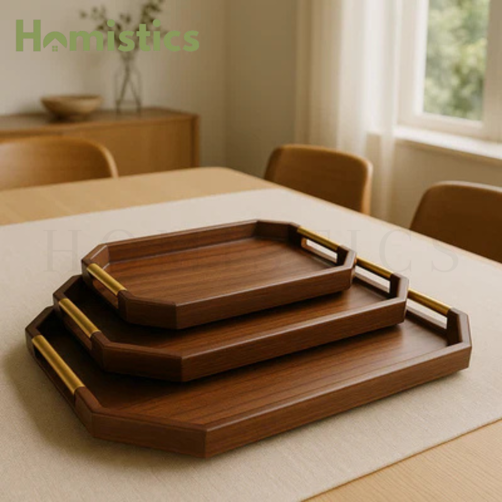 This elegant three-piece wooden serving tray set is beautifully displayed on a modern dining table,...