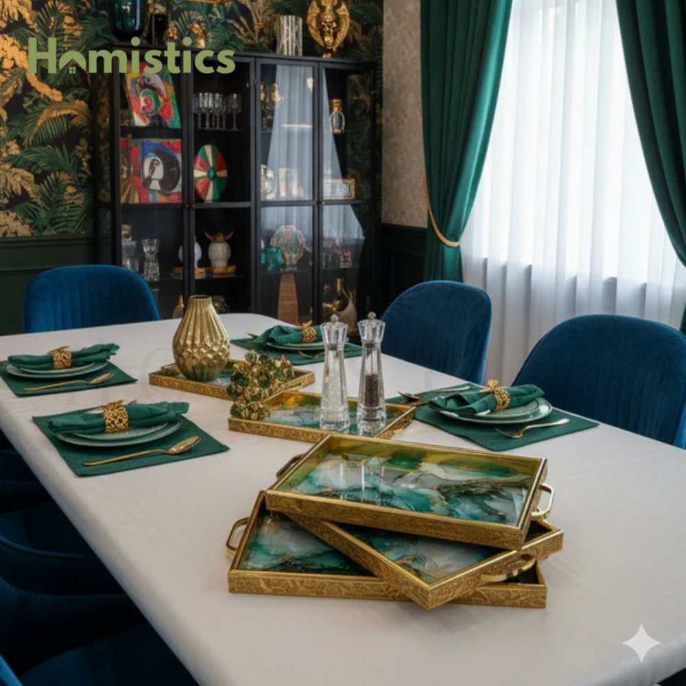 Luxury 3-Piece Green and Gold Abstract/Marble Serving Tray Set
