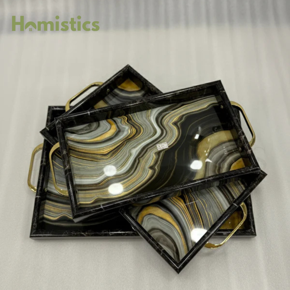 3-Piece Black Aesthetic & Gold Marble-Look Serving Tray Set