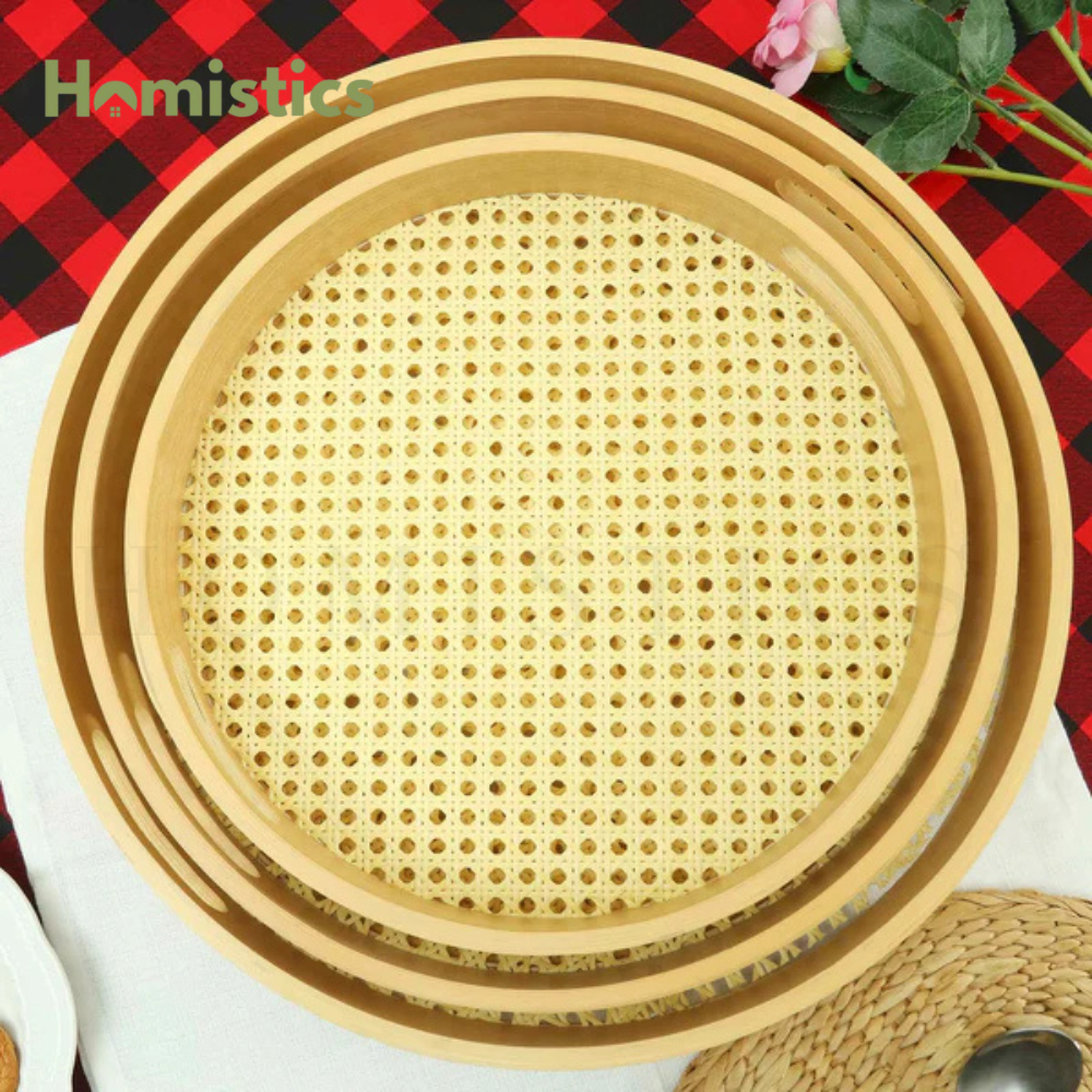 Antique Wooden Rattan Pattern Round Serving Tray Set Premium Craftsmanship: Each tray is meticulously crafted from...