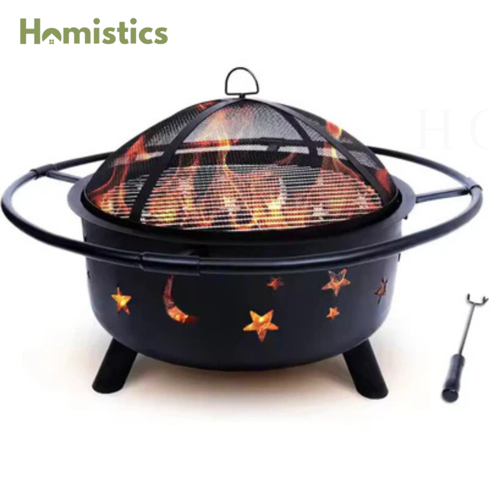 Big sky firepit with stars and moons design cutouts and black finish Sturdy steel construction...