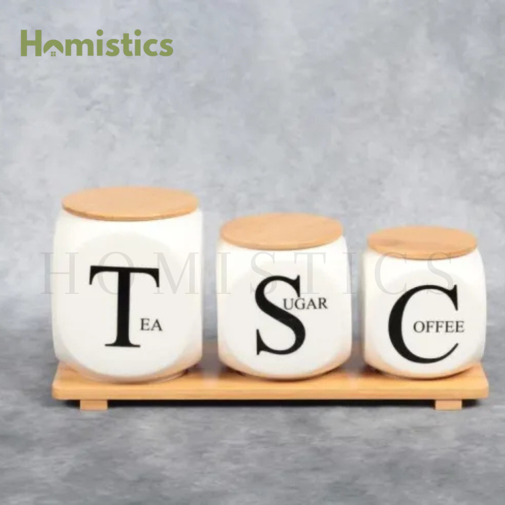 3-Piece Porcelain Air Tight Jar Set With Real Bamboo Wood Stand