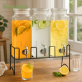 Elevate your drink station with this 3-in-1 glass beverage dispenser with a sturdy metal stand perfect for serving multiple drinks at once in style Designed with three separate glass jars, each equipped with an easy-flow spigot, this drink dispenser ses is ideal for juice, water, cocktails, iced tea, lemonade, sangria, or infused drinks