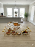 Design and Features: Each tray is finished with stylish, sturdy gold-toned metal handles attached to the shorter sides, providing both a functional grip and an elevated aesthetic. The contrast between the clear, gold-flecked body and the solid gold handles creates a sophisticated and modern look.