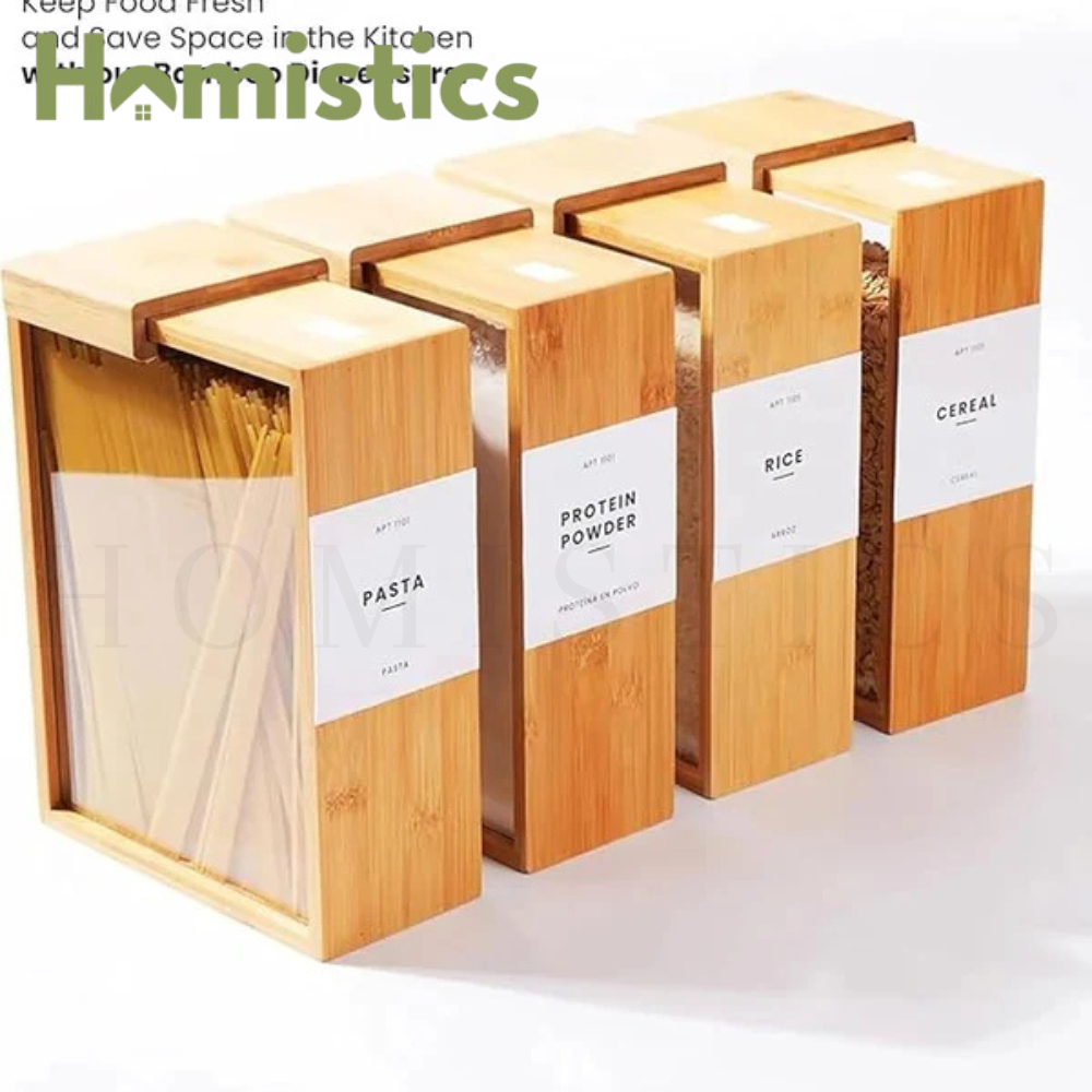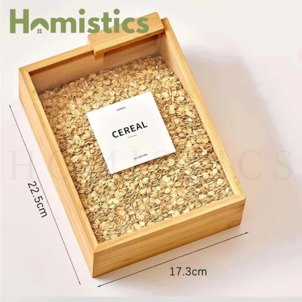 The sliding lid glides without sticking. Get one or two units to store different items in every box. Cleaning is easy. Wipe with a soft damp cloth. It fits neatly in kitchen cabinets, pantries, or on open shelving. This bamboo grain storage box is sturdy, reliable, and designed for regular use.