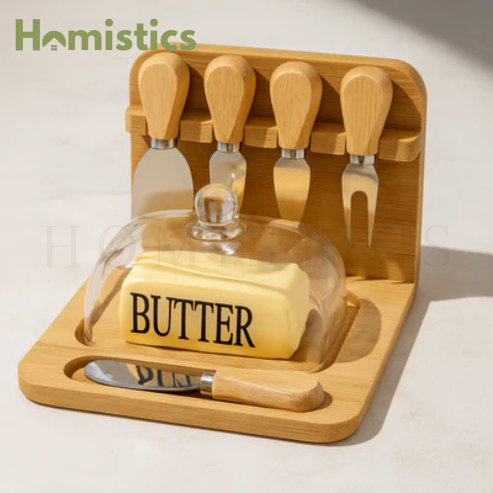 The natural bamboo base provides a warm, eco-friendly aesthetic while ensuring durability and stability. The crystal-clear glass dome keeps your butter or cheese fresh while allowing for easy visibility. It comes with a set of four stainless-steel cheese knives, each featuring a comfortable wooden handle, neatly arranged in an integrated bamboo holder for convenience and display.