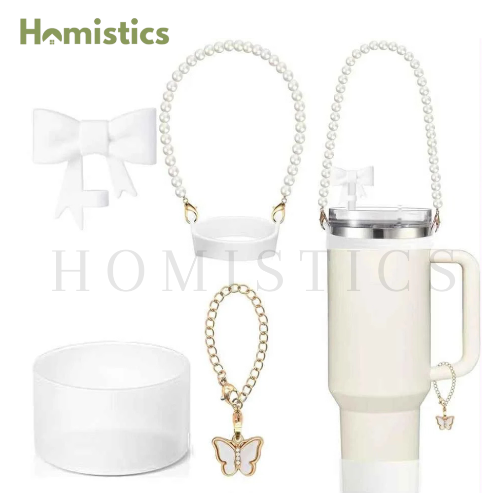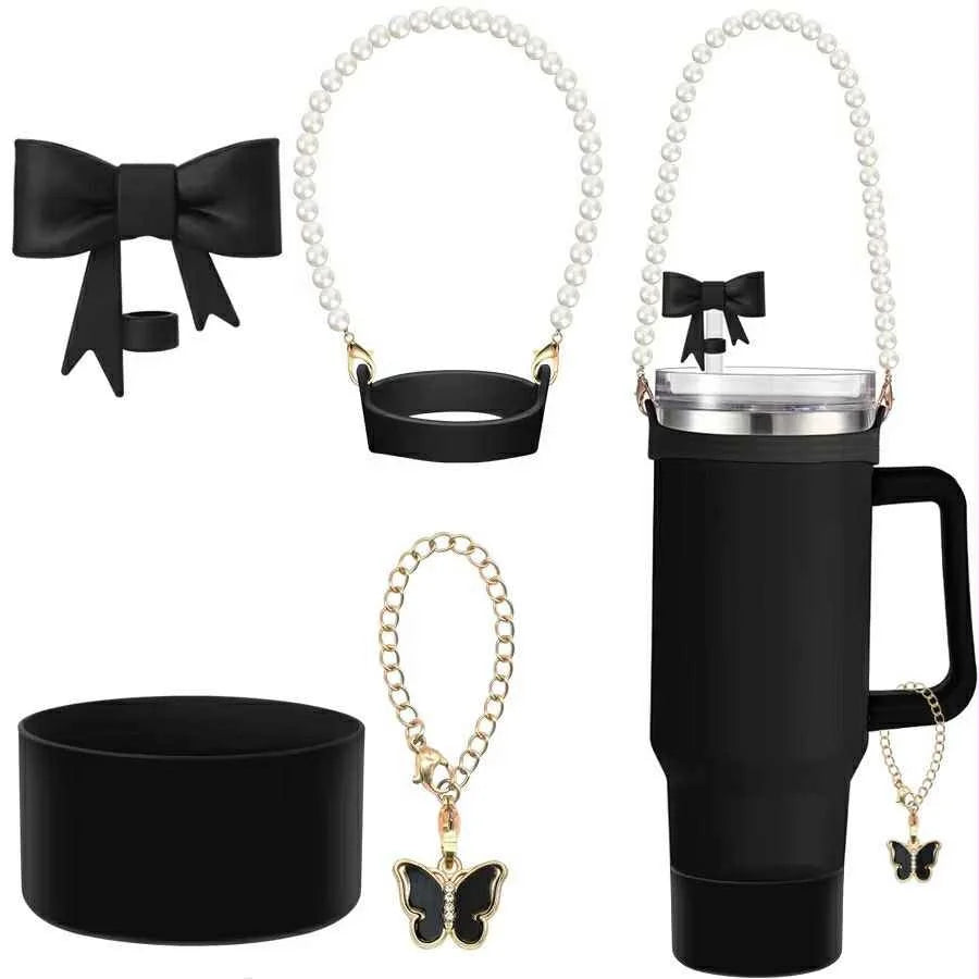 The set includes -1pcs water bottle handle strap, 1pcs Silicone boot, 1pcs silicone straw Large Bow cover, , 1pcs Butterfly Chain for Handle , The product does not include Stanley cups