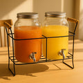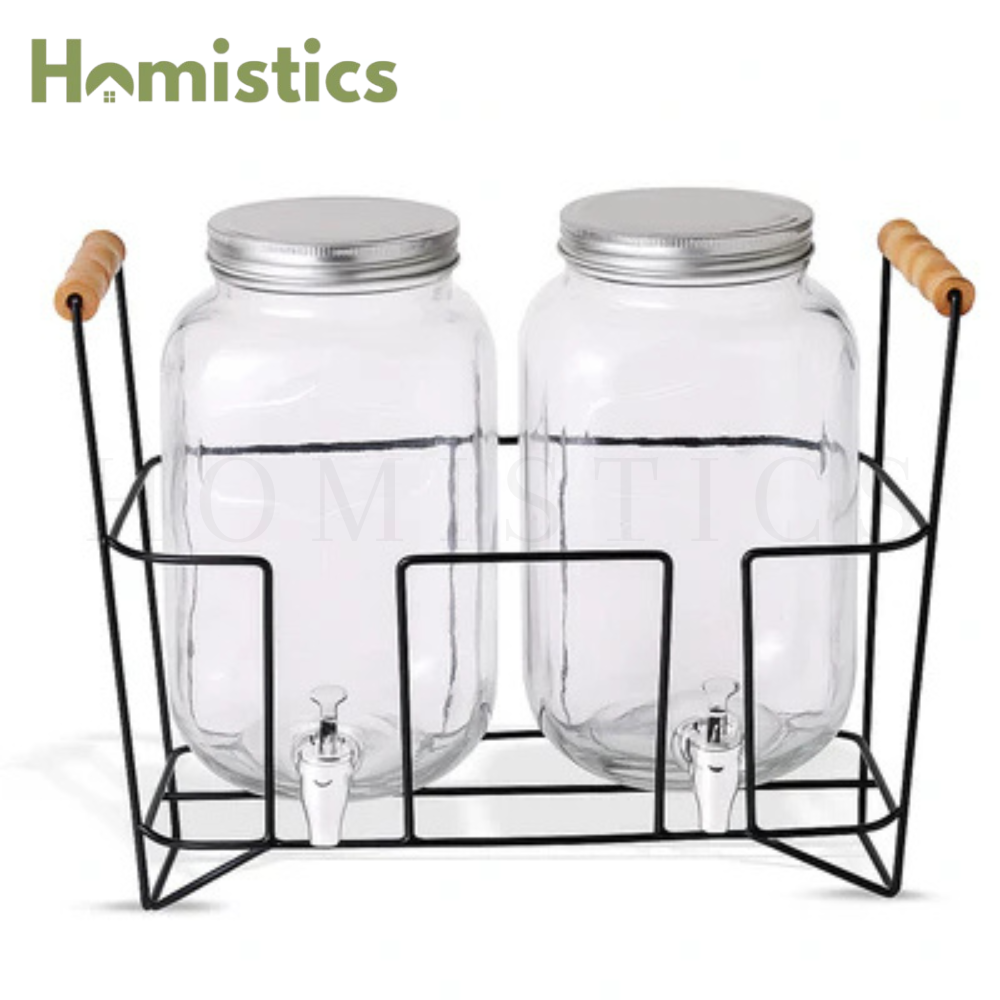 Serve your favorite beverages in style with the Double Drink Dispenser With Stand, a perfect blend of practicality and elegance. Designed with two large glass containers, each featuring a 1.9L capacity (total 3.8L), this dispenser set is ideal for hosting gatherings, parties, and family events.