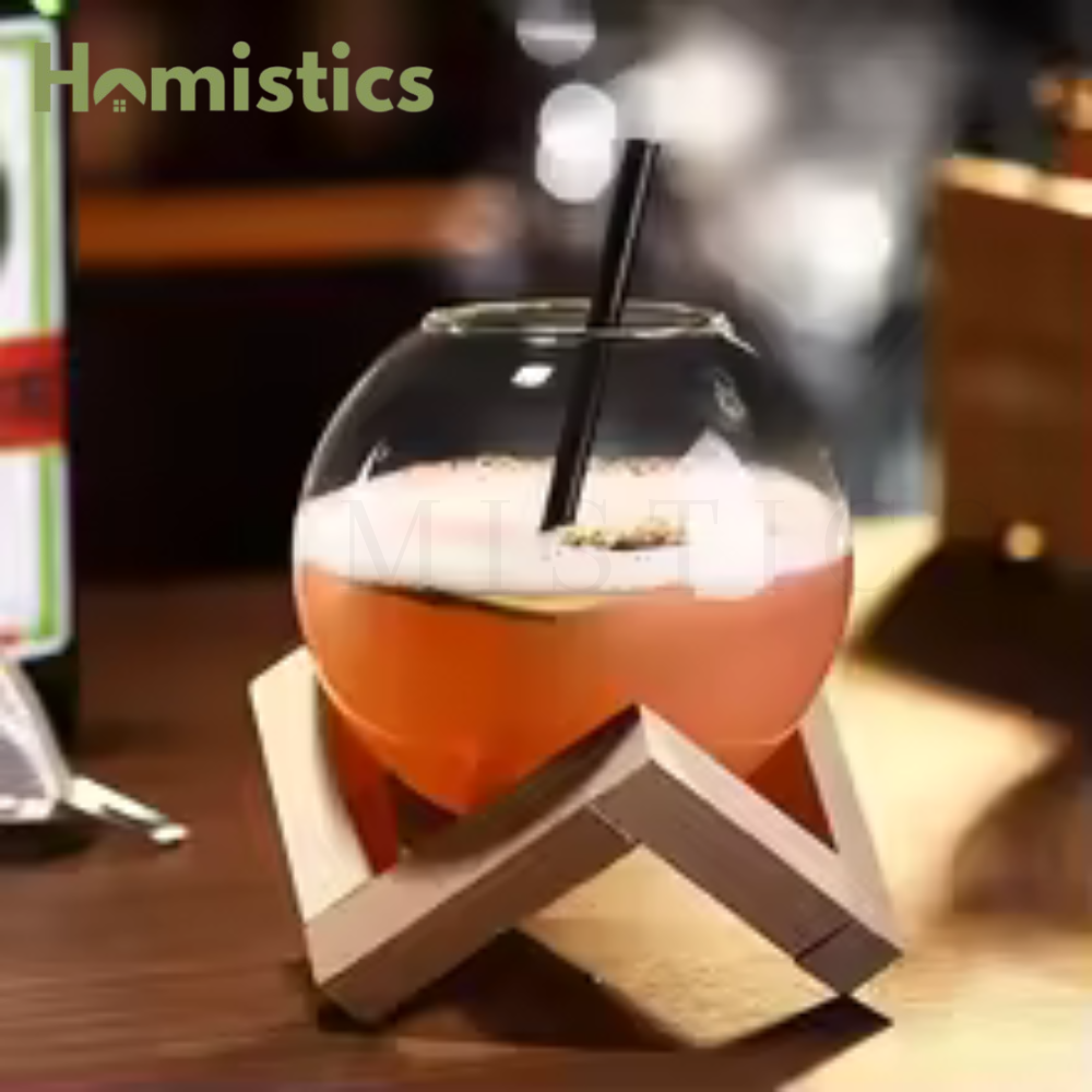 Enhance your drink experience with this creative lunar round-shaped glass cup, designed with a stylish wood stand for added elegance.