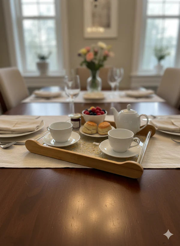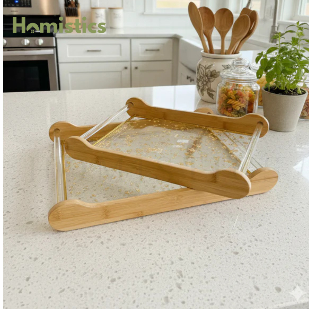 The frame and handles are crafted from natural bamboo or light wood, providing a warm, contrasting, and organic border to the clear material. The wooden pieces appear to be smoothly finished with rounded edges for a comfortable grip and polished aesthetic. Brass or gold-tone accents (like the cylindrical posts or corner joints visible on the base) complement the gold leaf and enhance the overall luxurious feel.