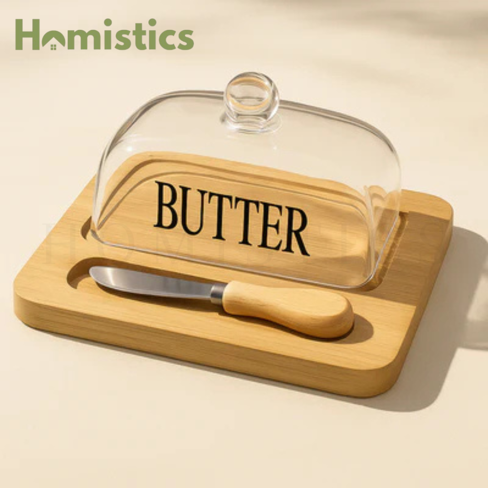 The crystal-clear glass dome allows you to see the contents easily while maintaining freshness, and the eco-friendly bamboo base provides a smooth, sturdy surface for serving. The included stainless-steel butter knife with a wooden handle fits neatly into a groove on the board, ensuring everything you need is within reach.