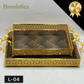 This Luxury 2Pcs decorative tray set (Model: L-04) features two elegantly crafted, rectangle trays with intricate golden frames and ornate handles accented with leaf motifs. The trays are designed with a striking geometric and fan-patterned base, combining luxurious gold tones with modern aesthetics, making them perfect for serving or displaying items at special gatherings, tea parties, or as a centerpiece for home decor. The elevated base and detailed cutwork on the borders add both style and functionality, offering a sophisticated touch to any setting.