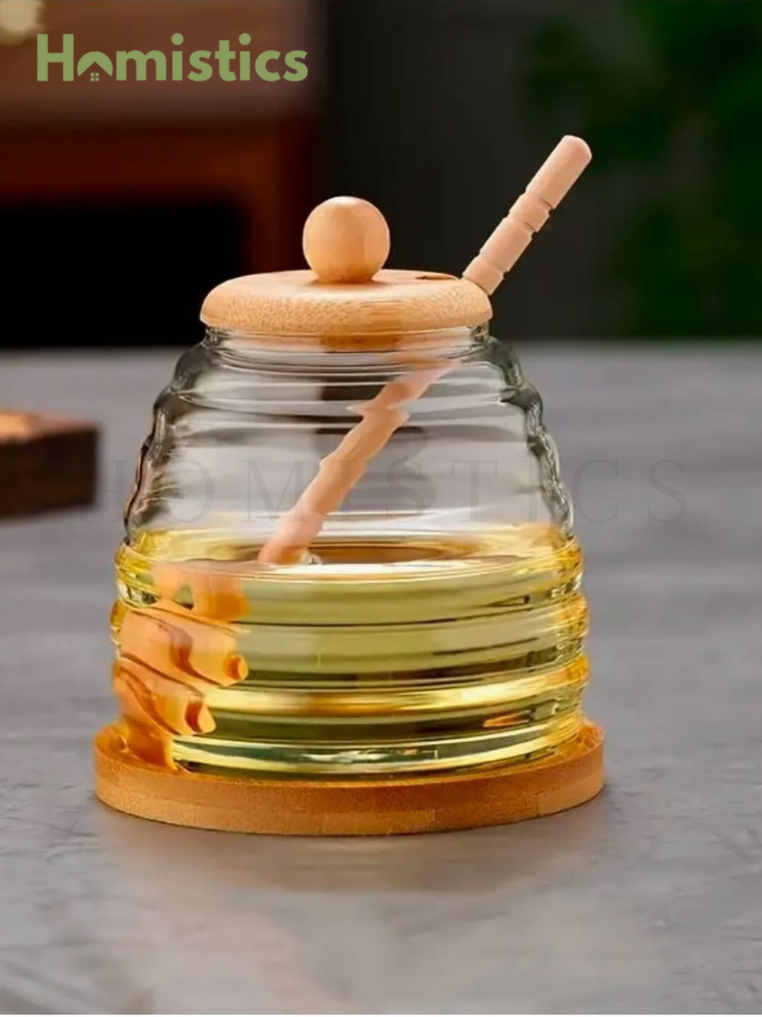 This glass honey jar with a wooden lid, stirring stick, and base offers a charming and functional way to store and serve your honey with ease