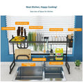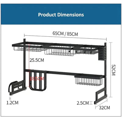Versatile dish dryer with 7 individual detachable supports that can be positioned as desired. 1 × dishwasher holder, 1 × bowl basket, 1 × knife holder, 1 × fruit and vegetable basket, 1 × cutting board / pot holder, 1 x detergent basket / holder, 1 x cutlery holder, 4 x hooks. All these parts can be adjusted and removed according to your preferences. Our stainless steel sink holder with cooking surface, easy to clean and rust resistant. Thoughtful design and sturdy materials firmly secure the entire structure, making our sink drying rack more durable and suitable for holding more items. The maximum load capacity of this dish drainer is up to 100 lbs. This organizer can help you save a lot of space and time by facilitating access to various utensils and fixtures, water will fall directly into the sink, making your kitchen cleaner and more organized. Before buying, please carefully measure the size of your sink. The dish drying rack with drain board comes with step by step installation manual for hassle free and easy assembly.