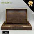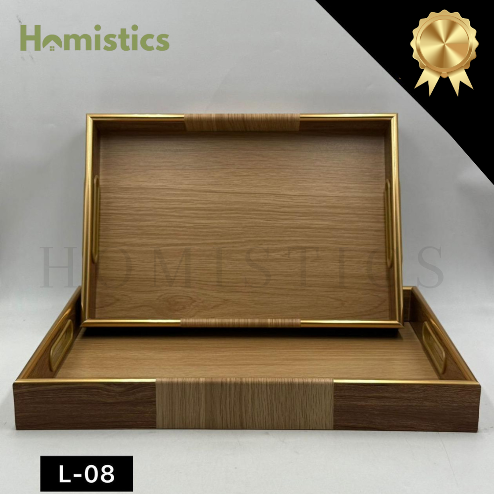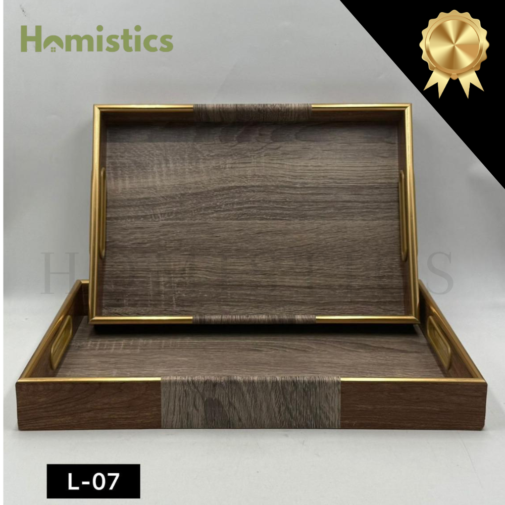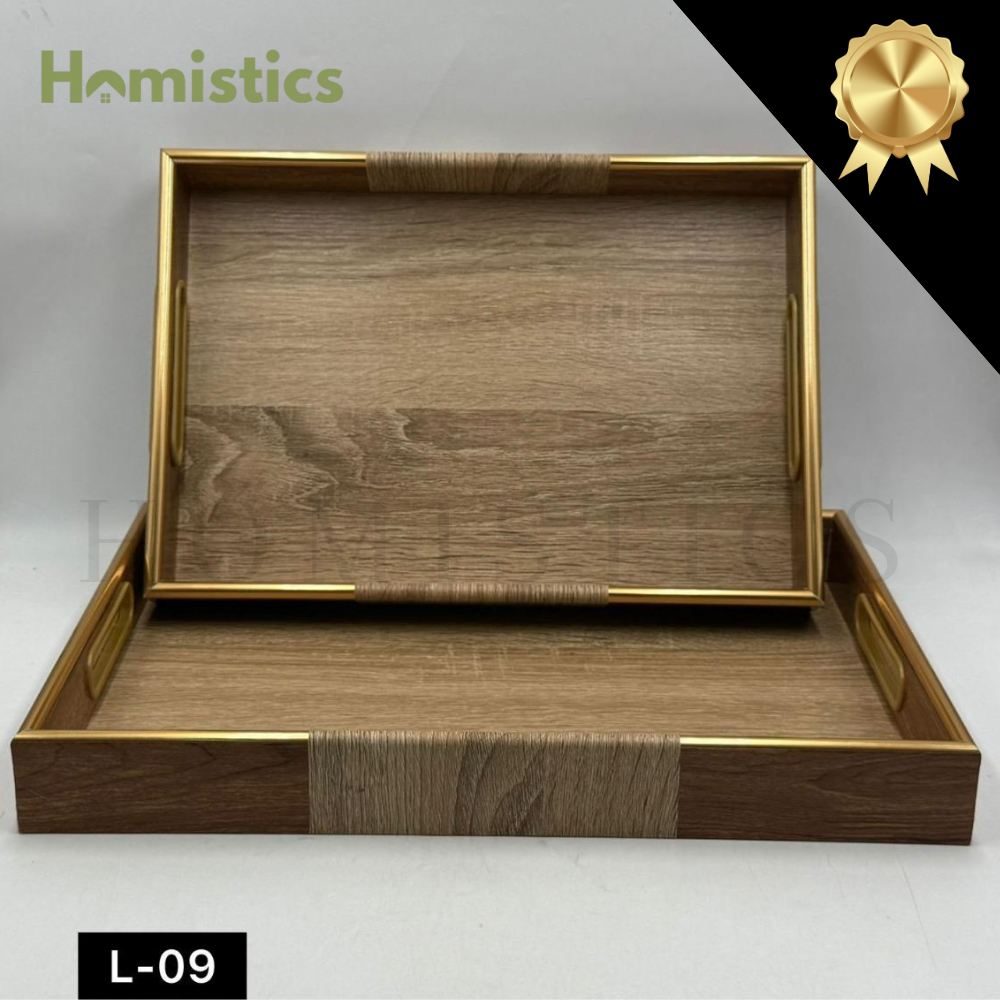Each tray is designed with a smooth wooden texture, accented by gold-finish borders that bring sophistication to your serving experience.
