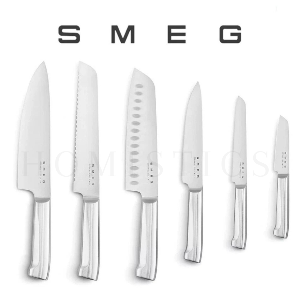 Each knife is expertly crafted from high-quality stainless steel, ensuring long-lasting sharpness, corrosion resistance, and perfect balance in every cut. The ergonomic handles offer a comfortable grip, while the stylish SMEG block adds a timeless retro touch to your countertop availatile in signature SMEG colors to match your kitchen aesthetic