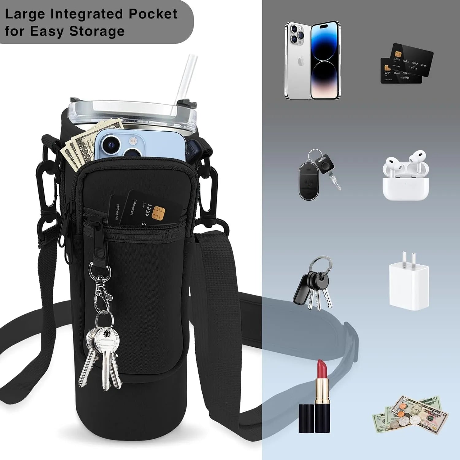 - 【Multiple Pockets Make Hands Free】An upgraded phone pocket allows you to store your phone in this pocket when not in use, and another zippered pocket provides enough space to hold cash, cards, lipstick, pens and other small items. Nothing is more hands-free than this stanley cup bag!