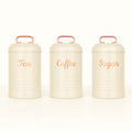 Crafted from high-quality metal, these canisters are durable, rust-resistant, and easy to clean. Each container features a tightly fitted lid to keep your Tea, Coffee, and Sugar fresh and aromatic. The smooth cream tone and warm copper accents create a cozy, vintage-inspired look that complements both modern and traditional kitchen spaces.